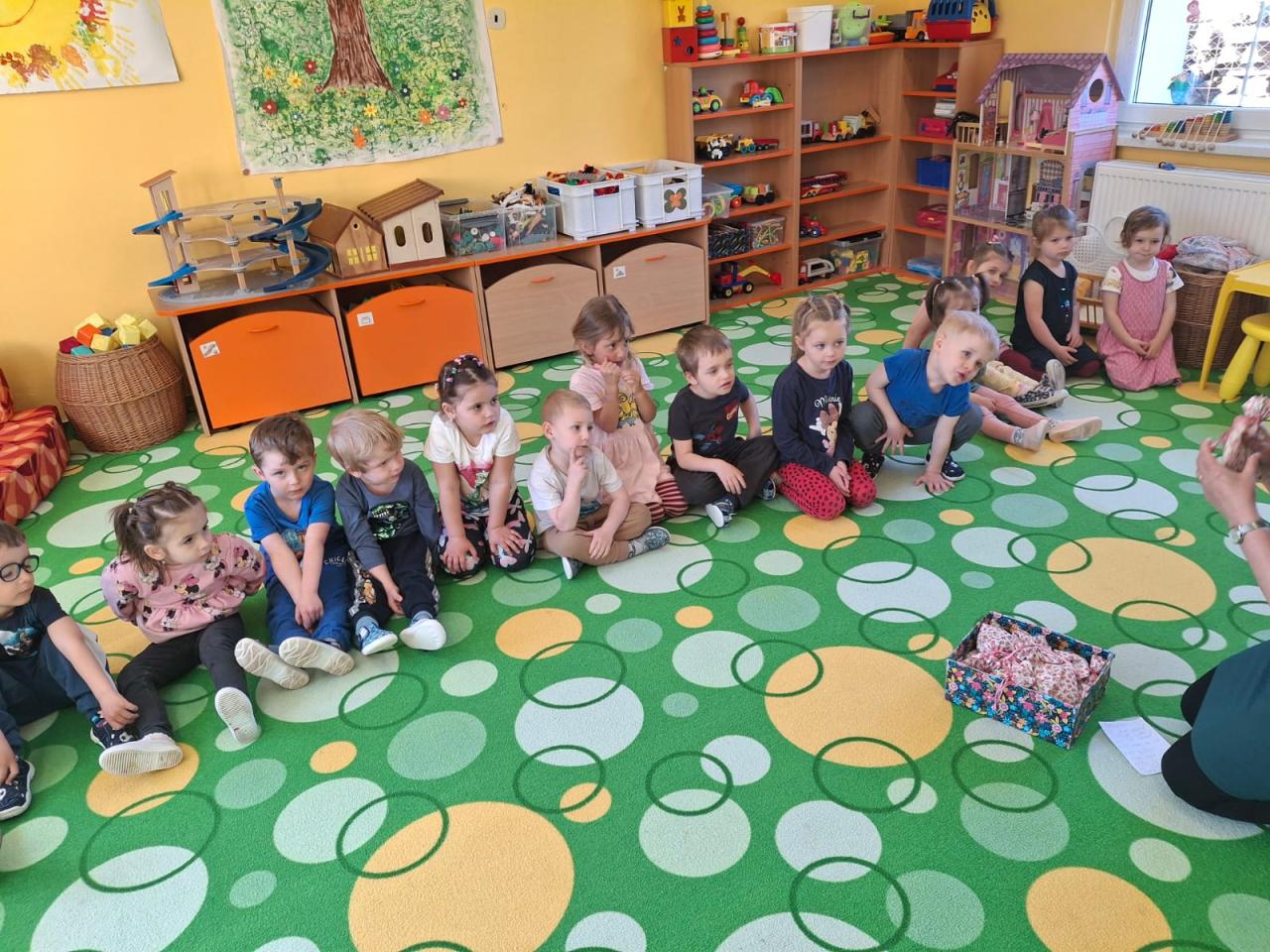 Procvičili jsme si hmatové a sluchové vnímání pomocí kouzelných pytlíčků naplněných různými přírodninami a materiály (šiškami, kamínky, fazolemi,…..) a my hmatem a sluchem poznávali, co je ukrytého v pytlíčku – hodně jsme se u toho společně nasmáli. Měli jsme keramickou dílnu, při které si vždy krásně procvičíme naše prstíky. Poznávali jsme rozdíly mezi dobrem a zlem, dávali suroviny do čarodějného kotlíku podle vzorové kartičky. Dělali jsme i čarodějnické rozcvičky, cvičili hemisférická cvičení, dělali cviky k uvolnění rukou, cvičili grafomotoriku na velké tabuli a hodně jsme modelovali a kreslili. Seznámili jsme se se základními geometrickými tvary (kruh, obdélník, čtverec, trojúhelník) a tyto tvary jsme i třídili do čarodějnických kotlíků – velice nás to bavilo. Oslavili jsme společně Stáníkovo svátek – všichni jsme mu popřáli a zazpívali písničku.