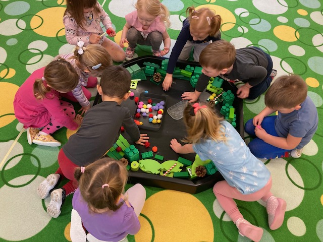 V předadventním čase jsme si povídali o adventu, co obnáší, jak je to s adventním věncem a svíčkami na něm. Věnec děti postavily s různých stavebnic ve velkém tácu a ozdobily dalšími doplňky jako jsou šišky, chlupaté bambulky, atd. Vyrobili jsme také stromeček, který byl umístěn do prodejny Coop, kdy jsme pracovali s temperovými i prstovými barvami. Na stromeček ve třídě děti pověsily ozdobičky, které samostatně vymalovaly a poslouchali jsme koledy. Za pomoci látek, víček, dřívek, krepového papíru atd. děti hromadně postavily krásného anděla podle vzoru na dotykové tabuli. Hráli jsme pohybové motivované hry, vyrobili na nástěnku adventní věnec a Mikuláše. Na velké kreslící tabuli vzniklo mistrovské dílo Mikulášů, andělů a čertů, kdy děti trénovali grafomotoriku a úchop fixy. Postavili jsme si i peklíčko ve kterém jsme ''uvařili'' čertovský guláš a na ''ohni'' spálili špatné skutky a strach z čerta. Na konci bloku nás navštívil Mikuláš v doprovodu andílka i rošťáckého čertíka. Za zazpívanou písničku a recitaci básničky děti dostaly nadílku.