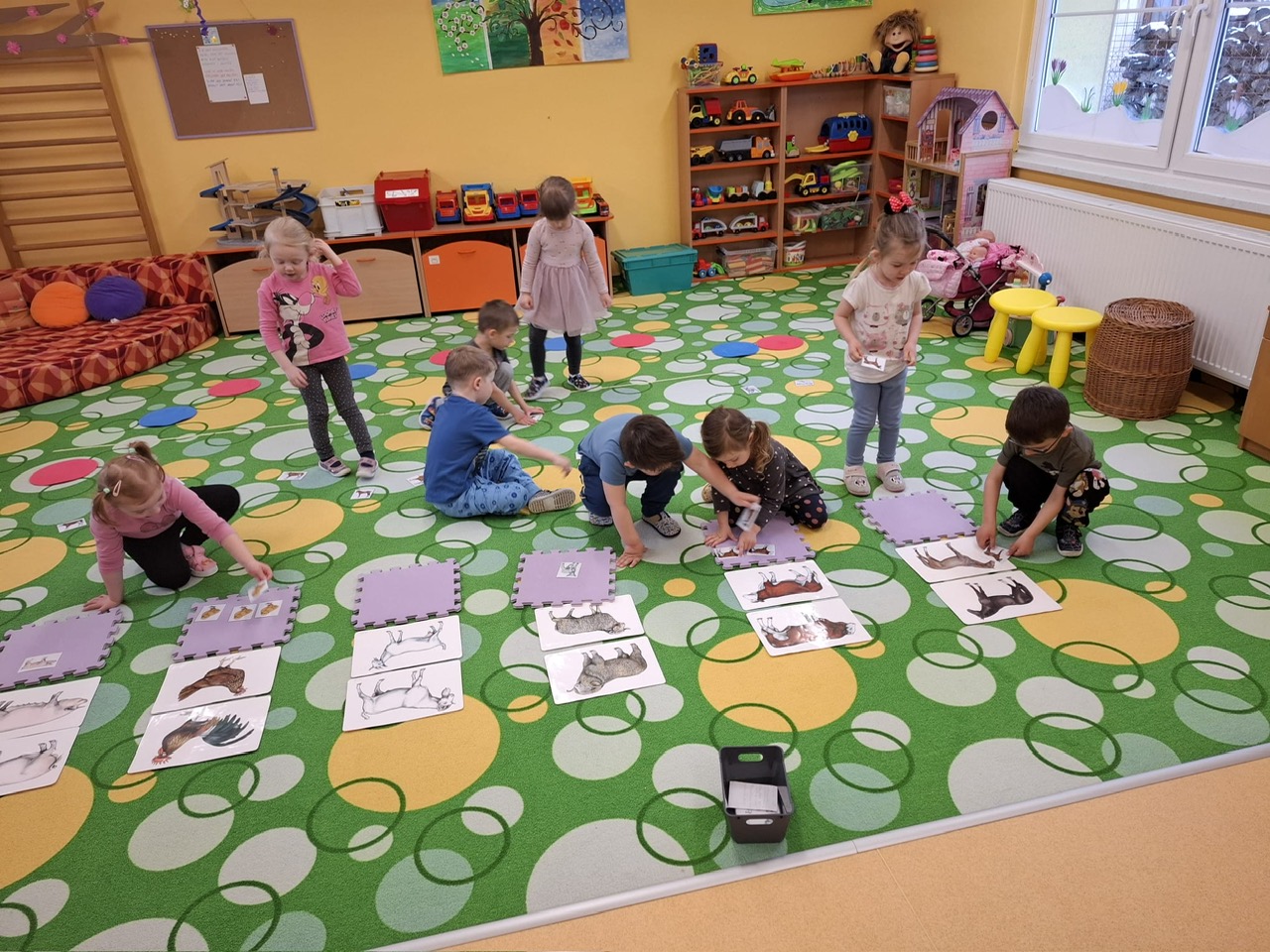 V předvelikonočním týdnu jsme se s dětmi učili koledu a hodně jsme se věnovali tvoření s velikonoční tématikou. Vznikala díla jednotlivců i společná. Vyskládali jsme si na koberec kraslici z různých druhů stavebnic, třídili jsme pestrobarevná vajíčka podle velikosti, řadili jsme je od nejmenšího po největší či hledali stejné dvojice. S pěnovými kraslicemi a zajíčky jsme procvičili svoje tělíčka při ranních rozcvičkách. V komunikačním kruhu jsme si představili velikonoční zvyky. Druhý týden jsme zahájili s pohádkou Ovečka Nina. Trénovali jsme pozornost a rozšiřovali slovní zásobu. Přiřazovali jsme mláďata domácích zvířat k jejich maminkách, učili jsme se všechna mláďátka a jejich rodiče pojmenovat, napodobovali jsme zvířecí řeč i jejich pohyb. Zpívali jsme písničku Když jsem já sloužil. Při cvičení jsme posilovali střed těla, trénovali dech či prstovou gymnastiku. Počasí nám docela přálo, mohli jsme si tedy užít i delší procházky. Na paloučku v lese jsme si hráli s přírodninami, trénovali jsme chůzi v lesním terénu a poslouchali zpěv ptáků. Na návštěvu k nám tentokrát zavítal pan Burghauser se svými ptáčky.
