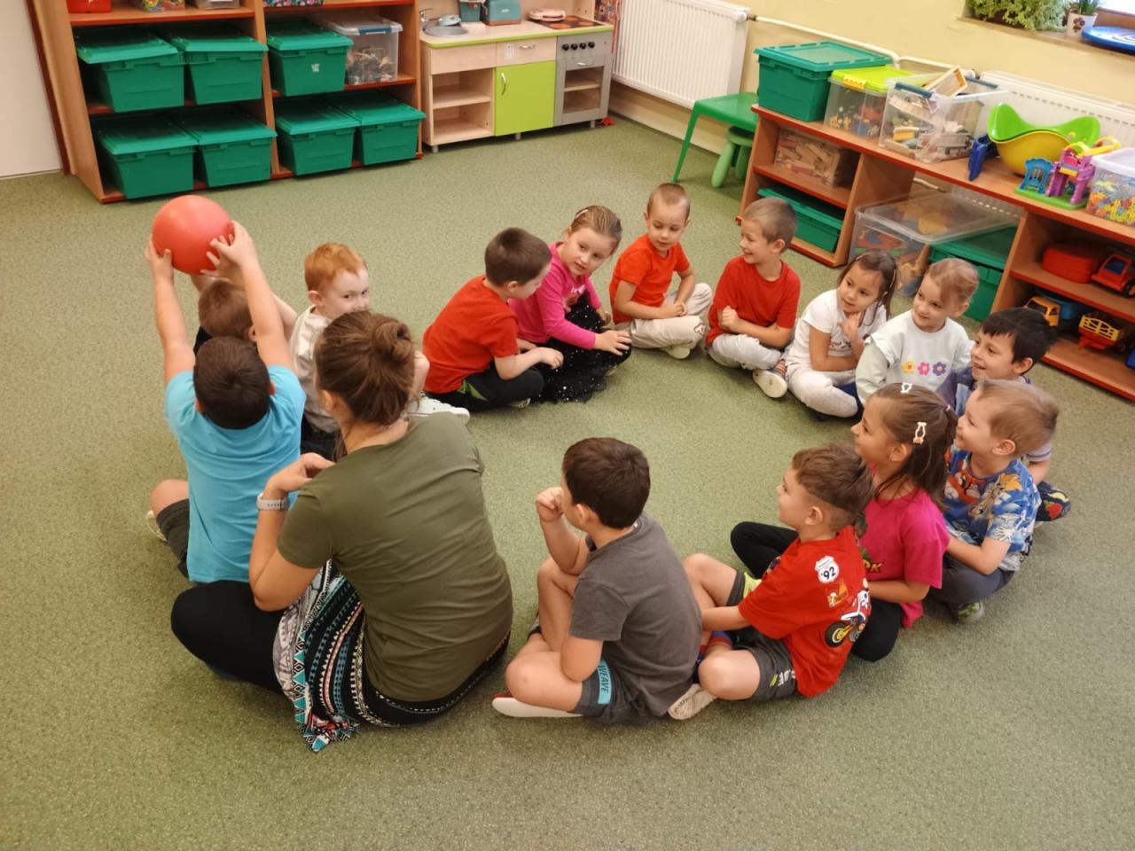 S příchodem podzimu jsme se s dětmi vydali na dobrodružnou cestu poznávání tohoto barevného období. Učili jsme se ho vnímat očima, ušima i rukama. Pomocí obrázků děti rozpoznávaly typické znaky podzimu – barevné listí, počasí či charakteristické podzimní přírodniny. Sluchové vnímání jsme rozvíjeli hravě: rozkládali jsme slova na slabiky, hledali první písmena a vymýšleli další slova. Jemnou motoriku si děti procvičily při hledání šípků mezi kaštany a vybírání malých hub pinzetou. Na „houbařské výpravě“ jsme třídili houby podle geometrických tvarů na kloboučku. Dokonce jsme si zacvičili jako velcí školáci v tělocvičně ZŠ. Na závěr jsme se vydali ke krmelci, kam děti donesly kaštany, jablka a další dobroty pro lesní zvířátka. Podzim jsme si užili naplno – smyslově, hravě a s radostí.
